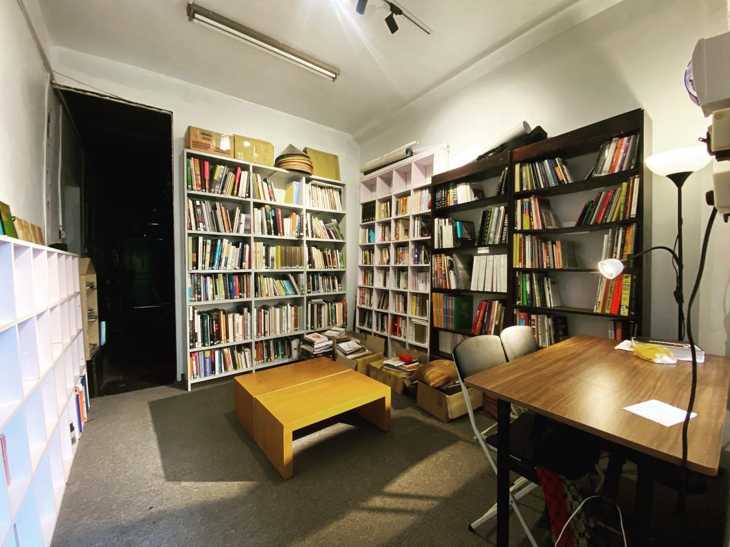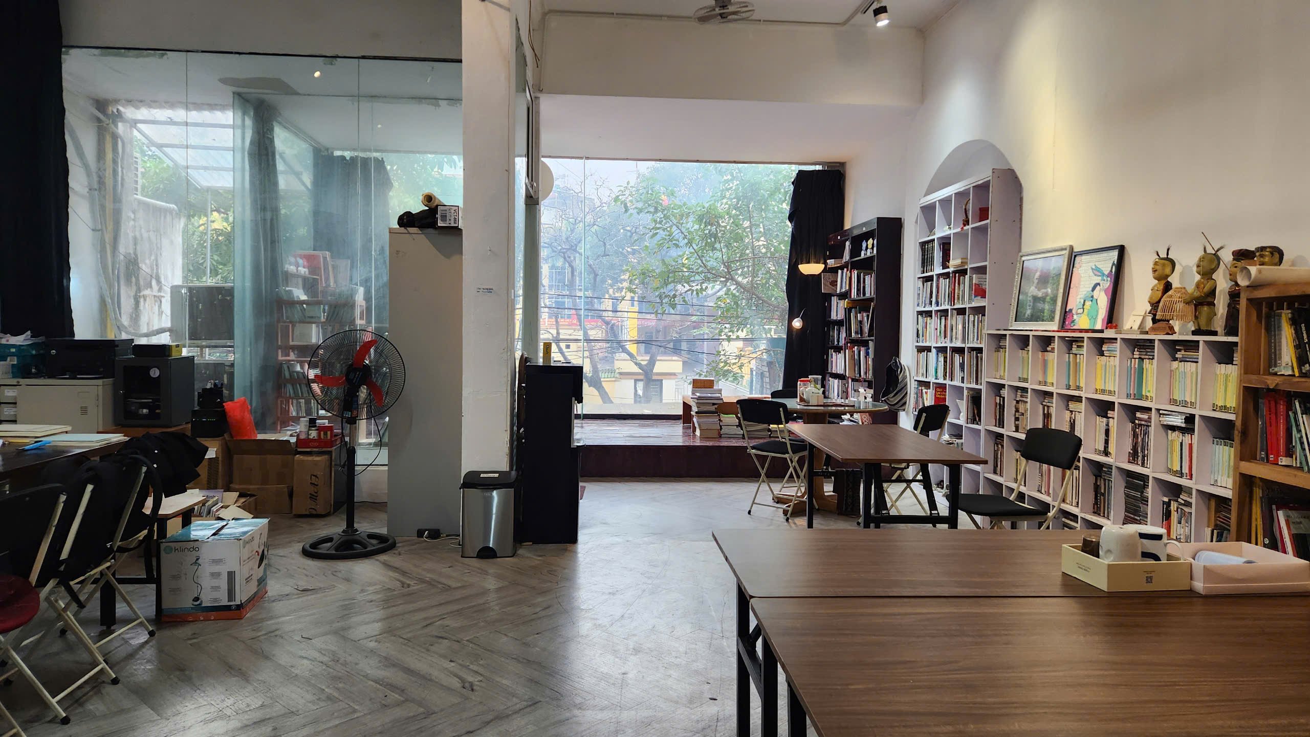 HAS has moved a total of four times in its decade-long existence. In its early years, the mixed-use complex Dolphin Plaza in western Hanoi sponsored HAS with a spacious area on its ground floor and mezzanine, which served as an exhibition and performance hall, a communal studio for HAS’s residency program, and a venue for film screenings, academic talks, and artist-led workshops. When the backing by Dolphin Plaza ended in 2019, HAS transitioned to self-financed, more modest spaces. Its first relocation was to an office at the Vietnam Institute of Culture and Arts Studies, where exhibitions could still take place in the institute’s gallery. However, impending renovations forced another move the following year, when HAS moved to the second level of a residential house shared with artist-curator-organizer collective ba-bau AIR on Thợ Nhuộm street, near Hanoi’s Old Quarter. Here, the venue served mainly as an office and an informal gathering place for seminars or artist talks. After two years, the limitation of space and difficulties with the landlord prompted yet another move, this time to an apartment on the third floor of a French-built tenement on Tăng Bạt Hổ street. Here, HAS could welcome small numbers of visitors to its library of over a thousand titles. Seeking a larger venue that can host small-scale events and accommodate more library visitors, the organization relocated once again in 2024 to its current home on the second floor of a shophouse overlooking the barracks of Vietnam People’s Army.